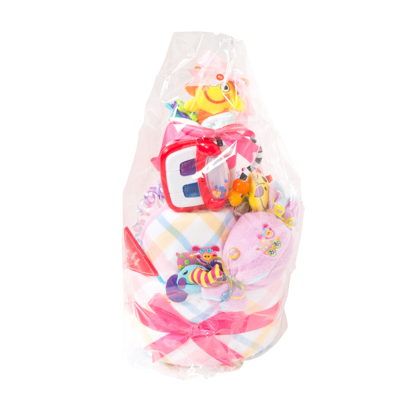 知育玩具ブランドSassyのおもちゃ、タオル、おくるみをセットにしたにぎやか&カラフルな紙おむつケーキ! もらってうれしい、ベビーシャワーのかざりにもバッチリのアイテムです!