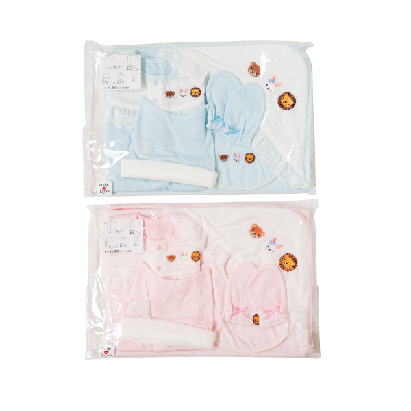 生まれてすぐの赤ちゃんに必要なアイテムをセットにしました! かわいい刺しゅうのレースのお洋服で、お披露目のときにおすすめです!