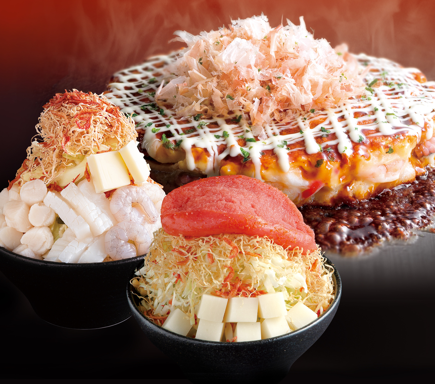 看板商品”自家製明太子もちもんじゃ”は、安政3年創業の築地魚河岸より直送された新鮮なたらこをお店で丁寧に漬け込んだ、ほんのり柑橘香る自家製明太子が味の決め手です。