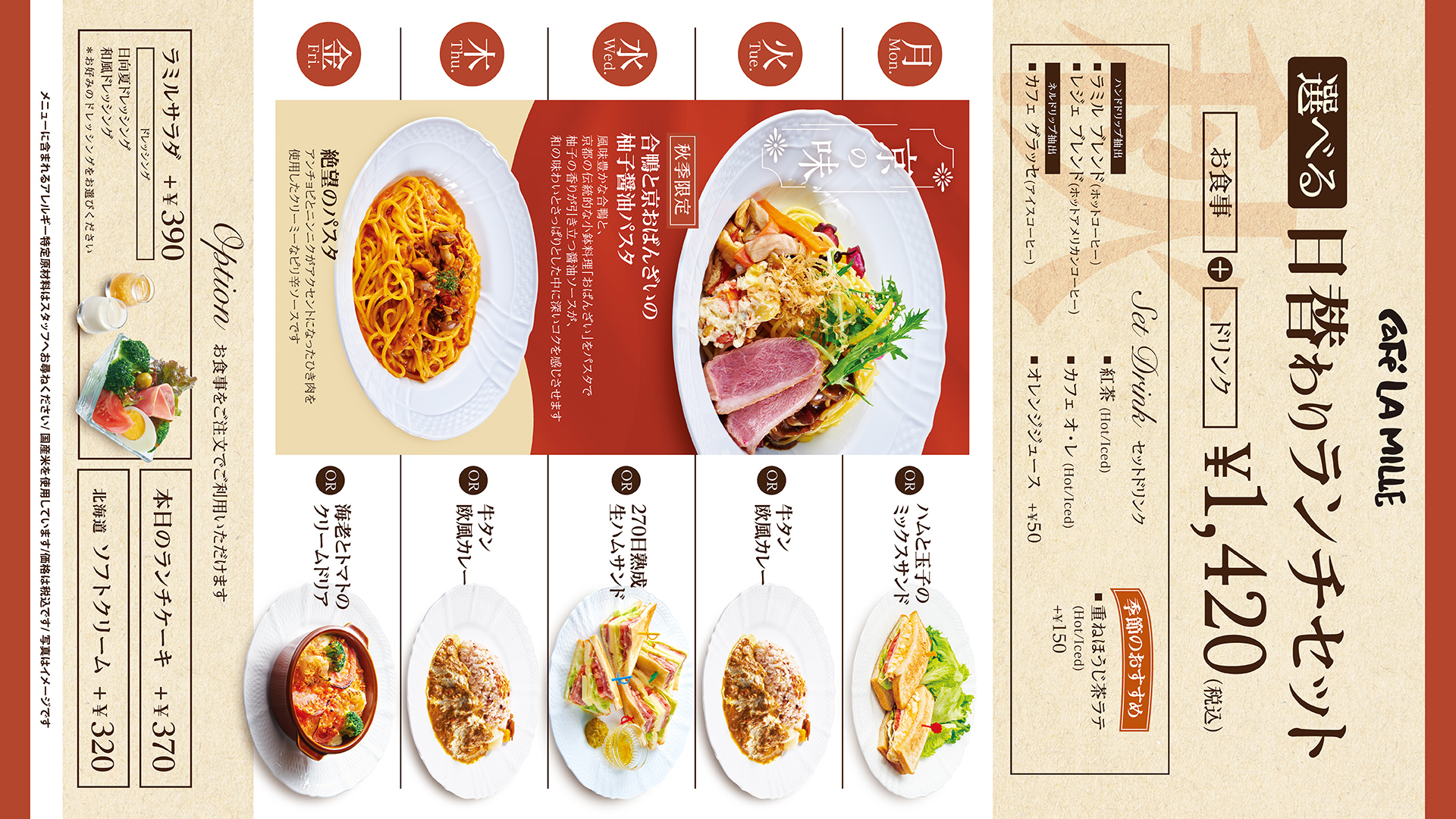 お得なランチセットはパスタ、ドリアやサンドイッチなど日替わりで選べるお食事にCAFE LA MILLEこだわりのドリンク付き。