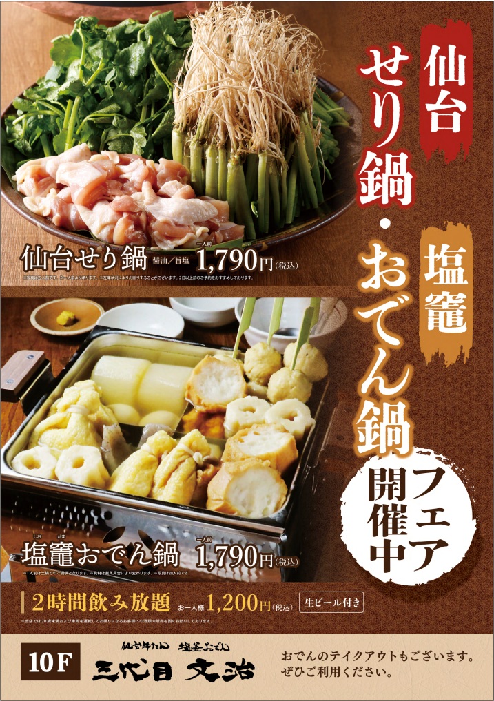11月1日(土)より季節限定の仙台【セリ鍋】と塩竈【おでん鍋】フェアを開催。