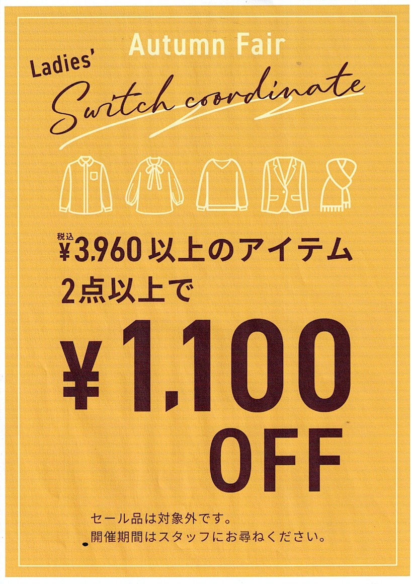 (税込)¥3,960以上の商品、レジにて『2点以上で1,100円OFF』!!