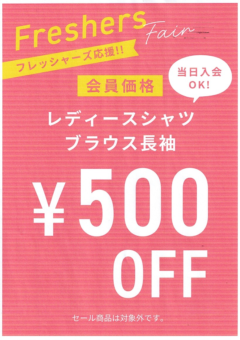 ・対象商品の税込 5,489円(超形態安定シャツ)、レジにて『税込 500円OFF』