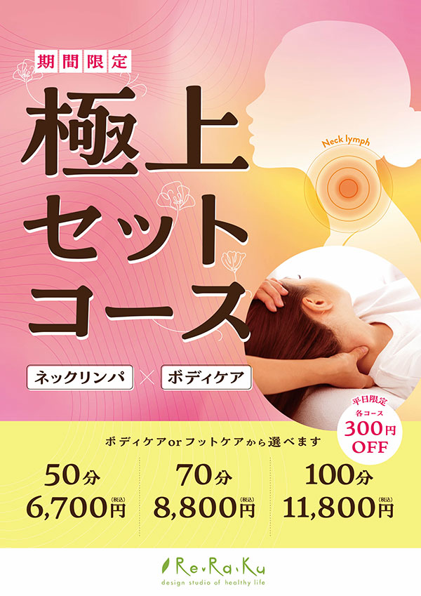仰向けで、首周りをジェル&クリームを使用しながらじっくり流すネックリンパと選べるメインメニューのセットのコースです。