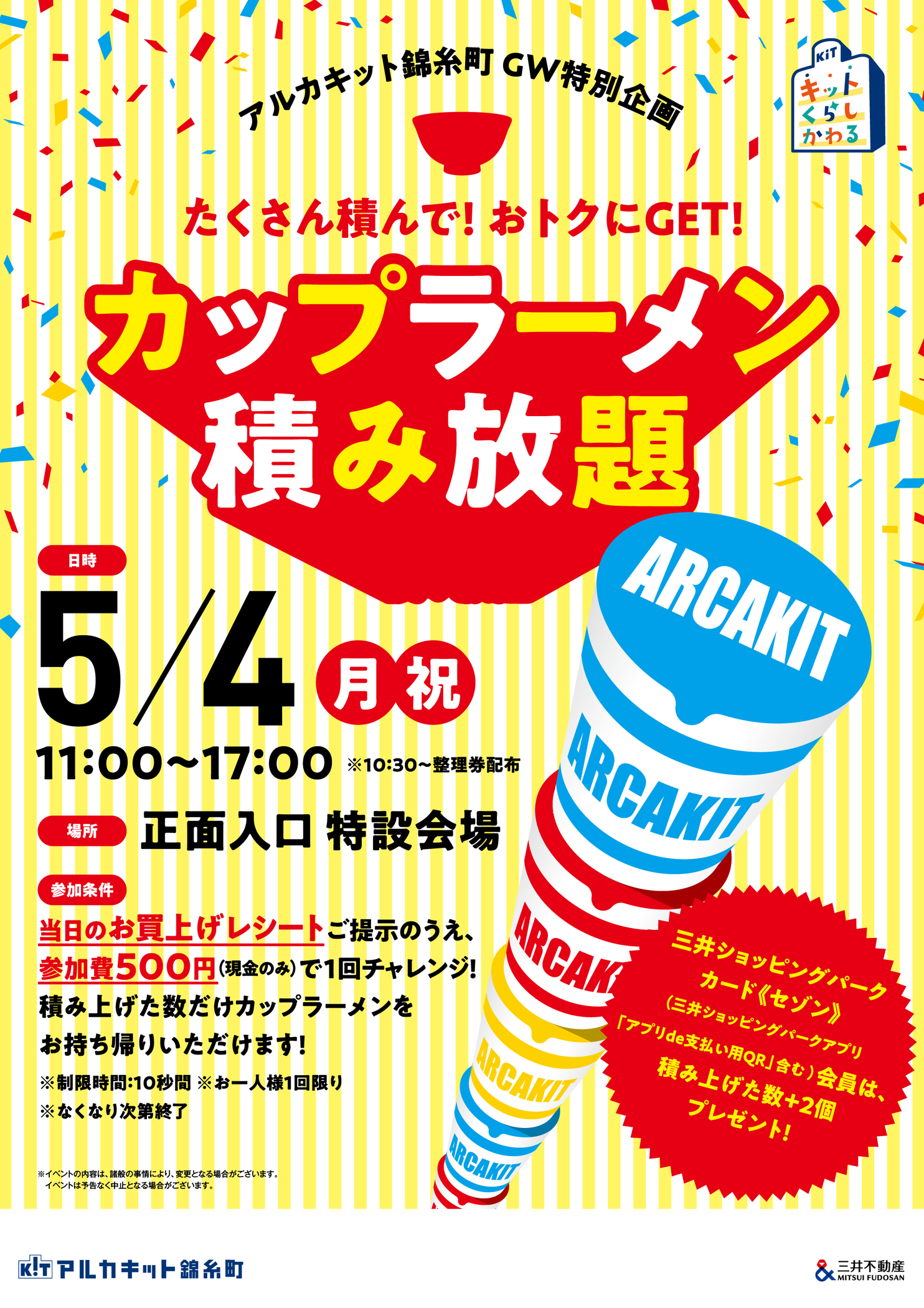 5月4日(星期一,假日)当天,Arcakit Kinshicho将举办“堆叠起来!享受超值优惠!无限量堆叠杯面”活动!