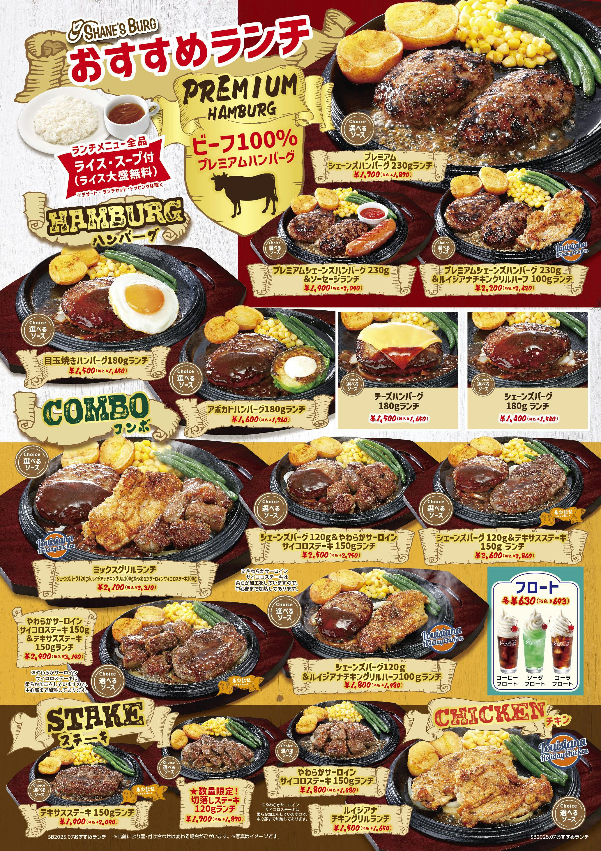 SHANE'S BURG的午餐包括各种多汁的 100% 牛肉汉堡牛排和鸡排组合菜单。
