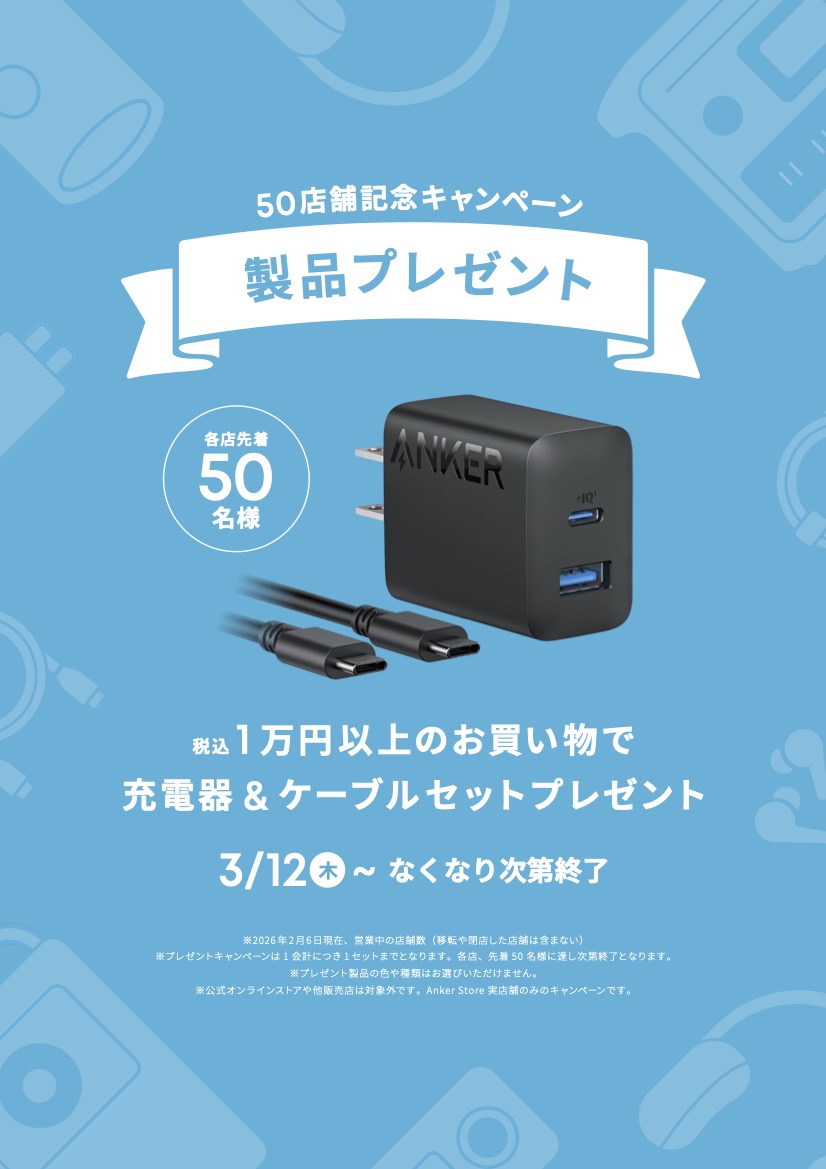 此外,前50名消费满10000日元以上的顾客将获赠充电器和数据线套装。欢迎莅临Anker Store东京PLAZA DiverCity门店,体验最新款产品,挑选您最心仪的一款。
