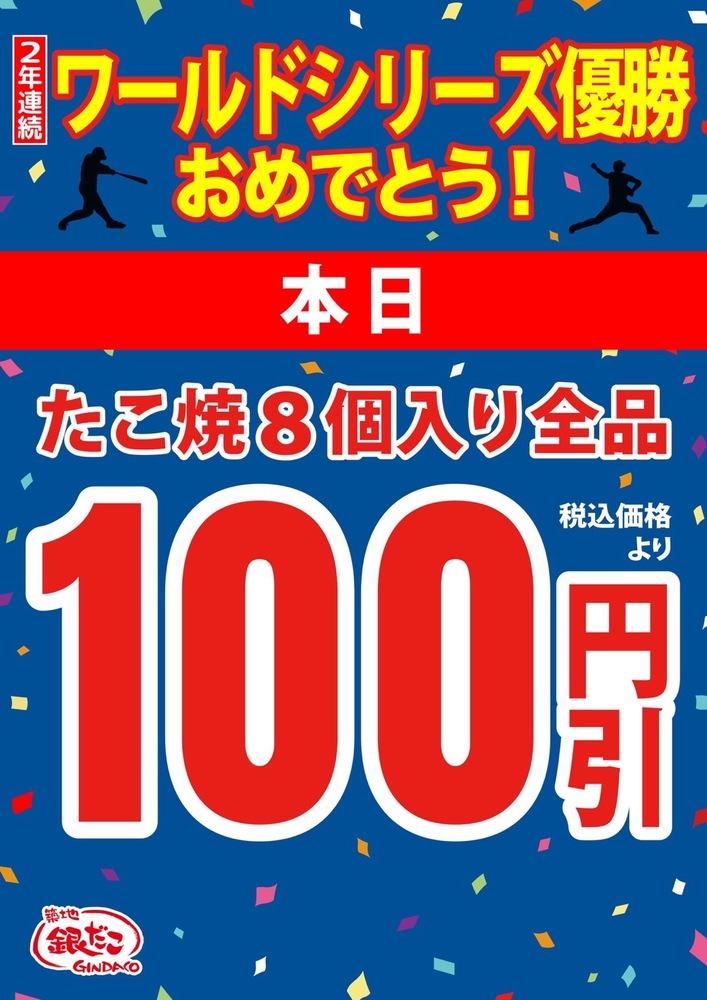 【 祝!2連覇‼】 ドジャース2年連続WS優勝を祝い、 本日より 『たこ焼(8個入り)全品100円引き』!