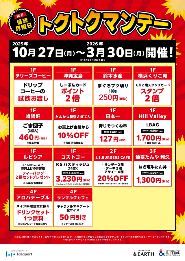 *活动可能变更或取消,恕不另行通知。“Kutoku Monday”将于12月暂停营业。