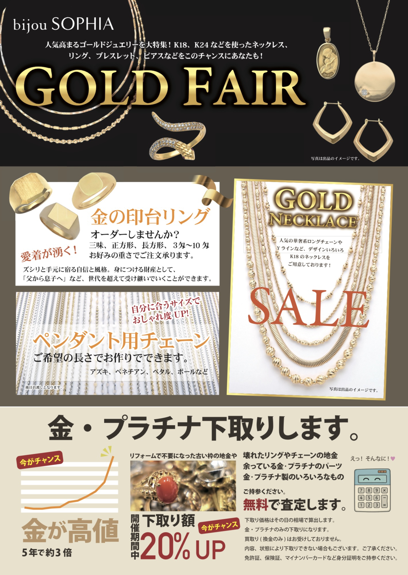 人气高涨的黄金珠宝大特辑!为您准备了使用K18、K24等的项链、戒指、手镯、耳环等!