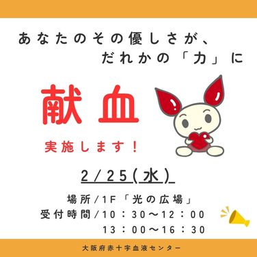 【2月25日,星期三】Osaka红十字会献血中心献血活动