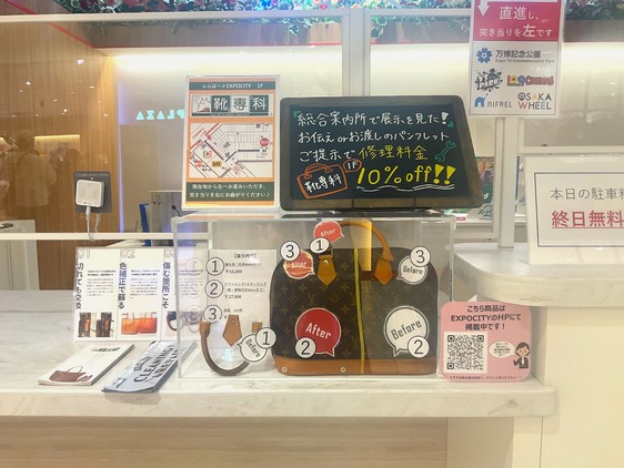 KUTSUSENKA是一家修理和清洁鞋子、包和夹克的商店。我们还制作复制钥匙并修理手提箱。 作为20周年KUTSUSENKA的第二部分,KUTSUSENKA LaLaport EXPOCITY店将举办包袋维修和清洗20%折扣活动,有效期至8月31日。请来拜访我们并利用这个特殊的机会。我们全体员工期待您的光临。