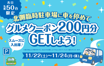 - 北側臨時駐車場に停めて グルメクーポン200円分GETしよう!