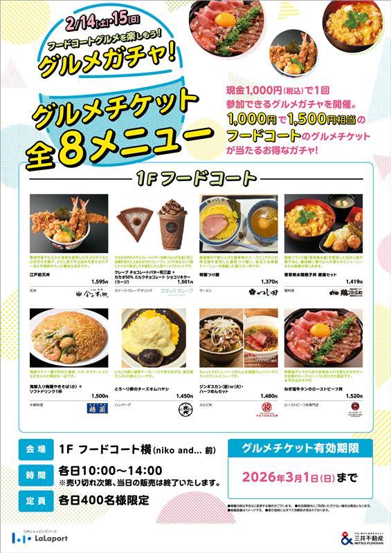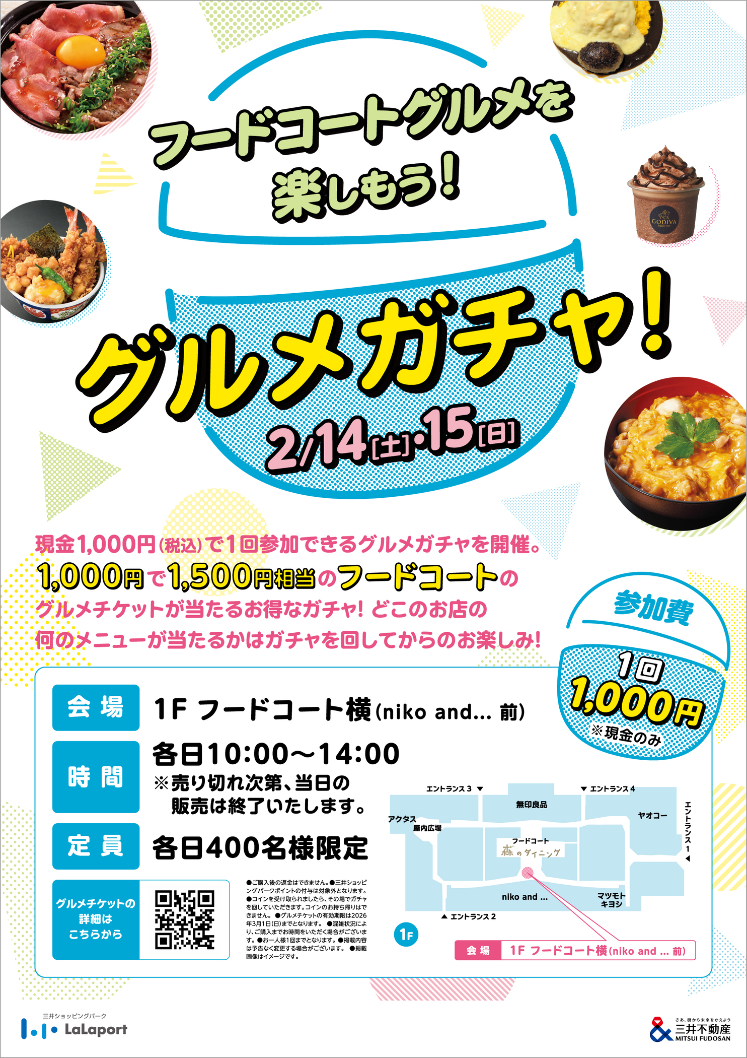 超棒的扭蛋游戏!只需1000日元现金,就有机会赢取价值1500日元的美食广场美食券!快来转动扭蛋机,看看你会赢得哪家餐厅和哪道菜品吧!