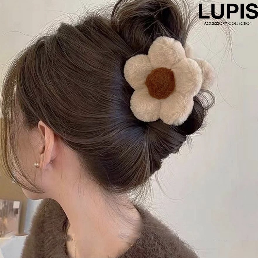 可爱的花朵发夹,带有蓬松的人造毛皮♡