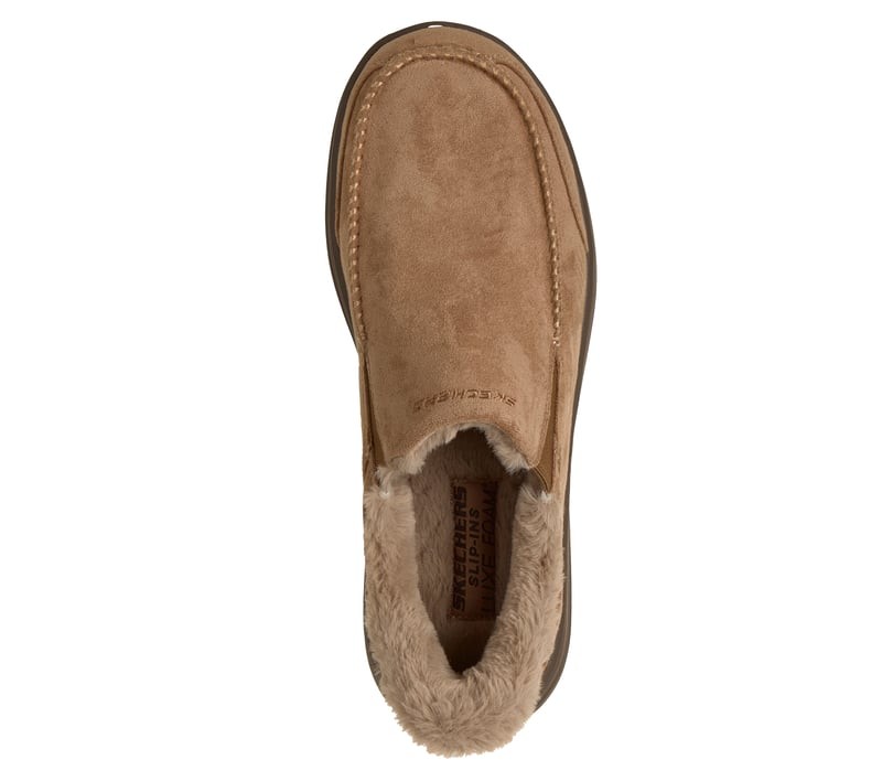 スケッチャーズ スリップインズ リラックスドフィット:ミュレット - スコフィールドはソフトなマイクロファイバーを使用したモックトーのアッパー、フェイクファーのライニング、Luxe Foam®(ラックスフォーム)フットベッドが特長です。