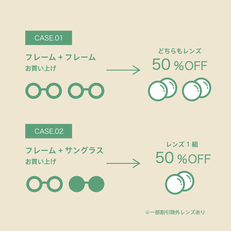 フレーム+フレームをお買い上げの場合、それぞれレンズ代が50%OFF。