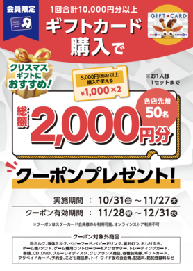 1回合計10,000円以上ギフトカード購入で合計2,000円分クーポンプレゼント!