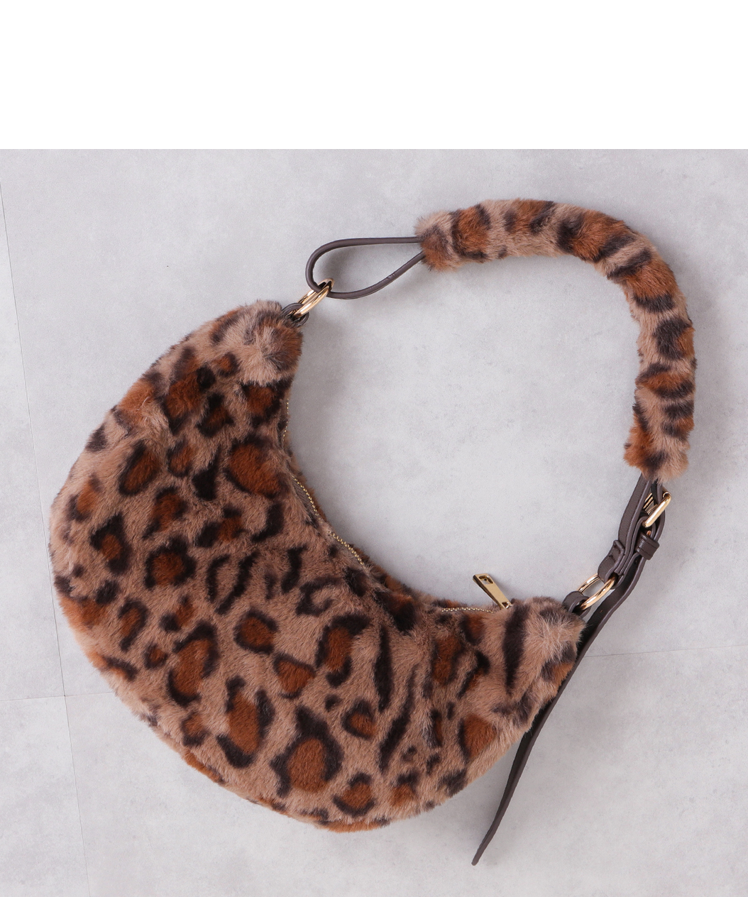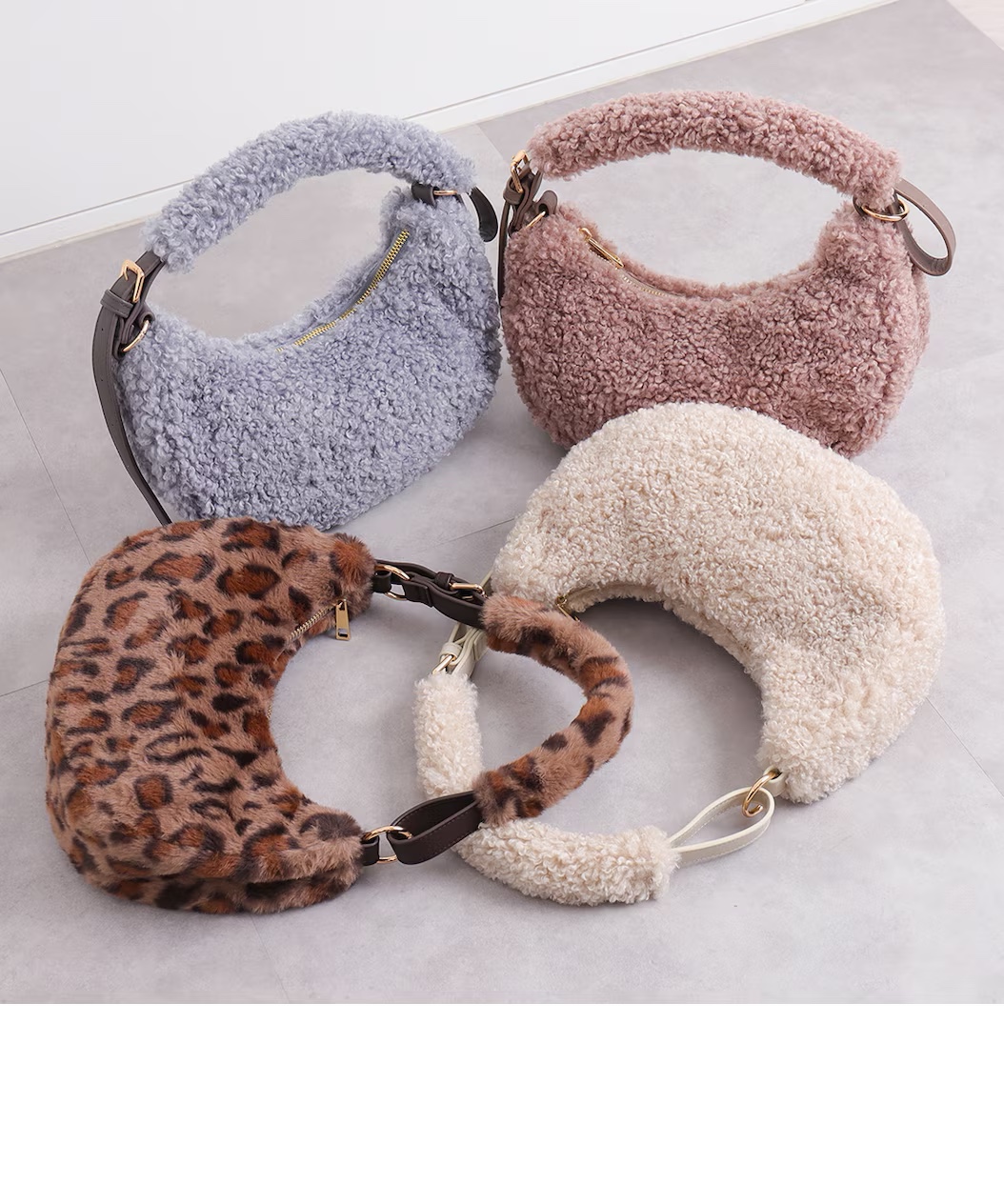 向您介绍一款附带肩带的2WAY人造毛皮半月包。