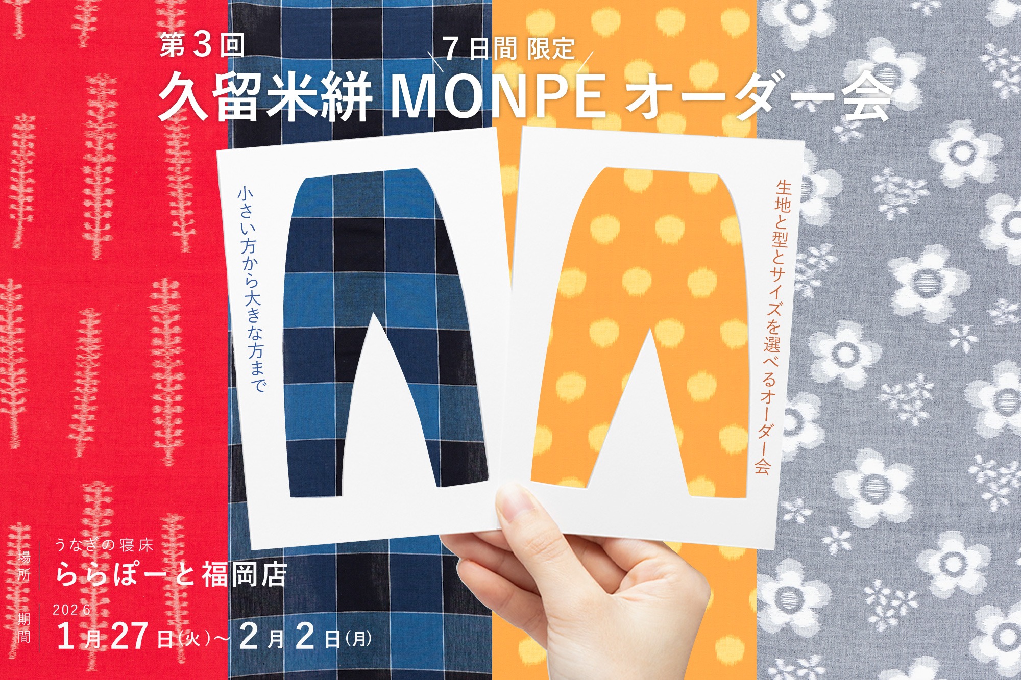 您可以从各种各样的久留米絣织面料中选择您喜欢的面料,我们将为您制作MONPE。