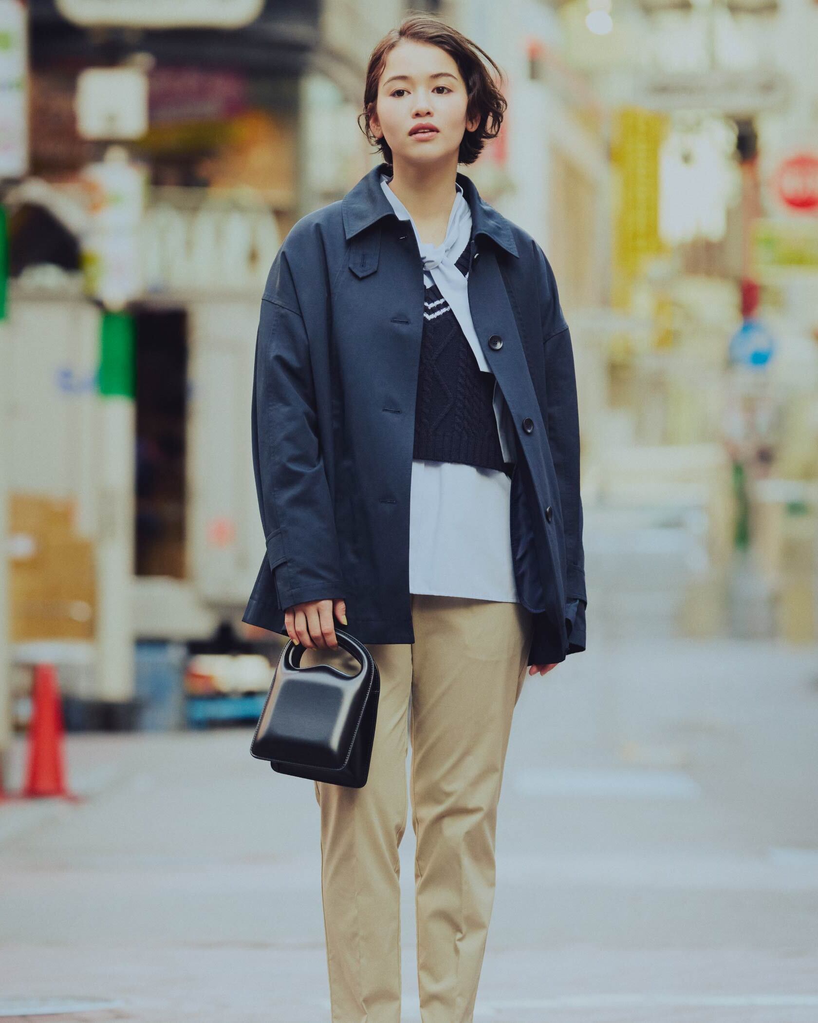 程良い光沢感がきれいめな印象を与え、大人カジュアルな着こなしに最適です。