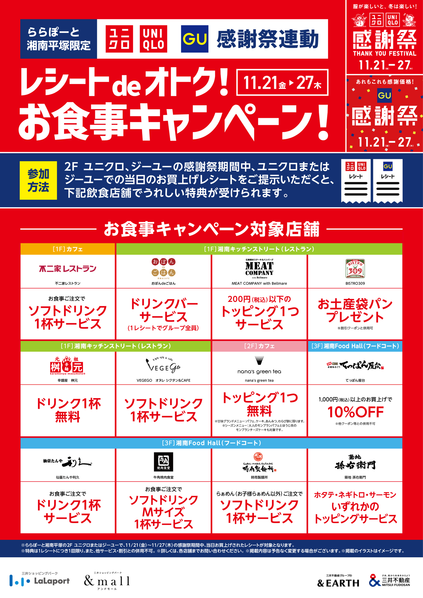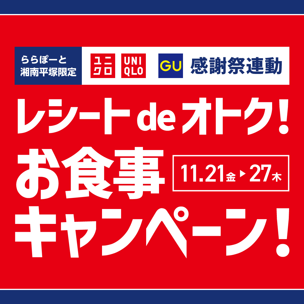 - <仅限LaLaport湘南平冢> UNIQLO和GU感恩节小票促销!用餐即可享受超值优惠!