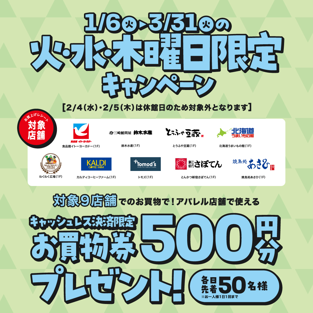 - 1/6(火)~3/31(火) 火・水・木曜日限定 アパレル店舗で使えるキャッシュレス決済限定お買物券500円分がもらえる!