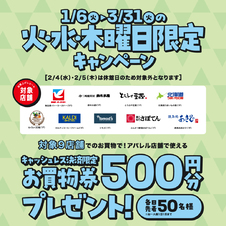 - 1/6(火)~3/31(火) 火・水・木曜日限定 アパレル店舗で使えるキャッシュレス決済限定お買物券500円分がもらえる!