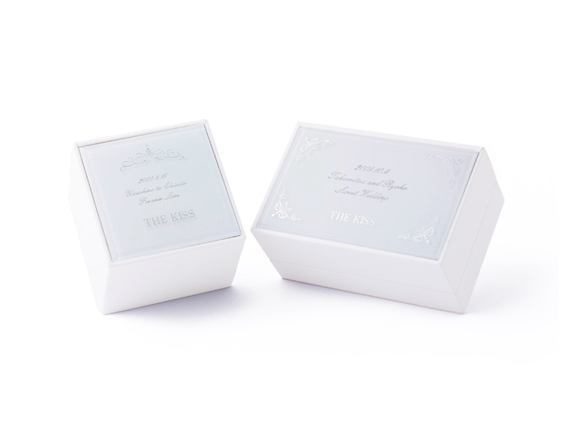 専用のジュエリーボックスに、おふたりの記念日やお名前、メッセージ(3種類から選択)を刻印するサービ