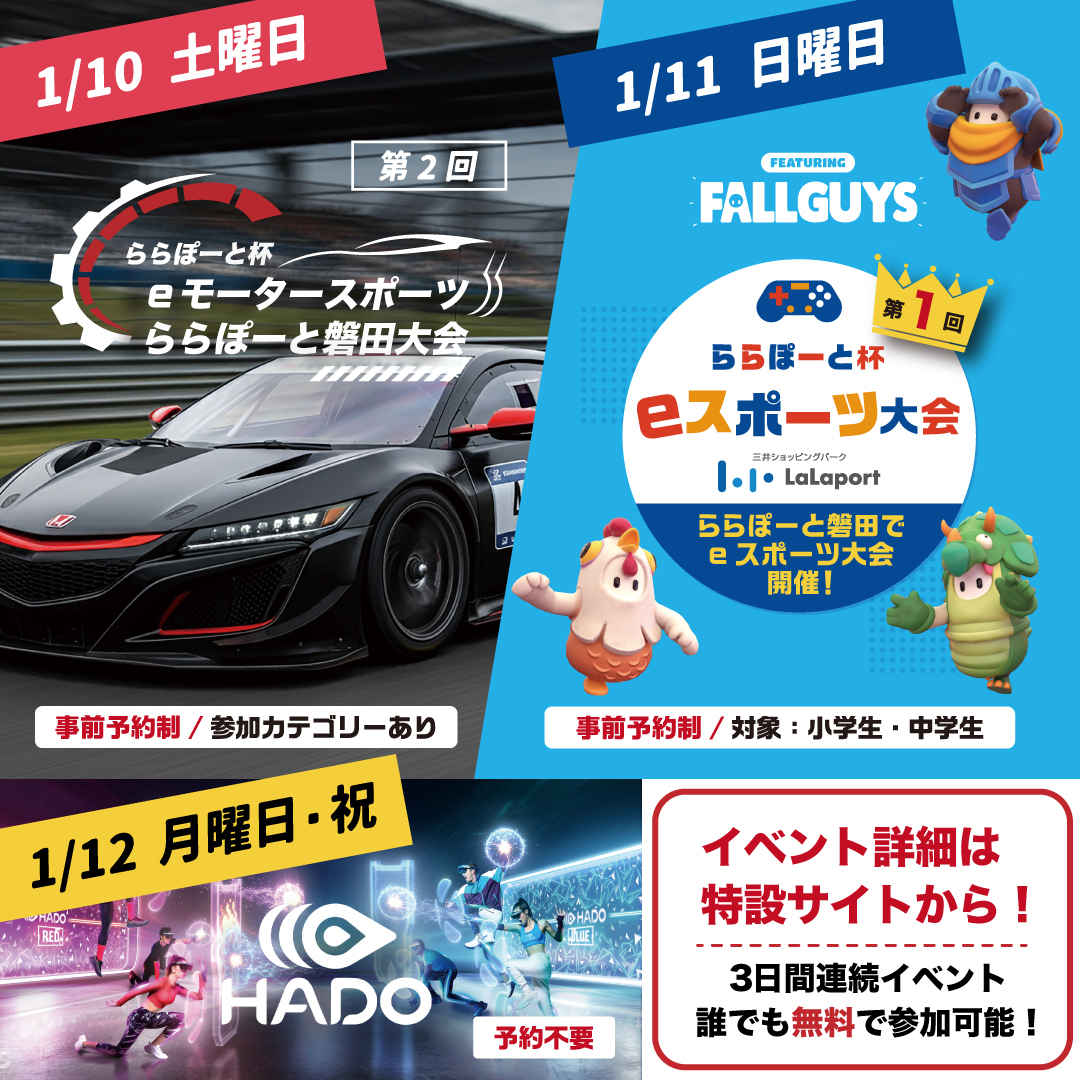 谁将荣膺LaLaport磐田冠军?这是一场类似运动会的电子竞技比赛,面向所有中小学生开放。在充满刺激的赛道上,你将体验跳跃、挑战极限等各种精彩项目,力争第一!比赛冠军将获得水晶奖杯和价值 10,000 日元的LaLaport购物券!除了比赛之外,我们还安排了自由体验环节。无需预约,先到先得。