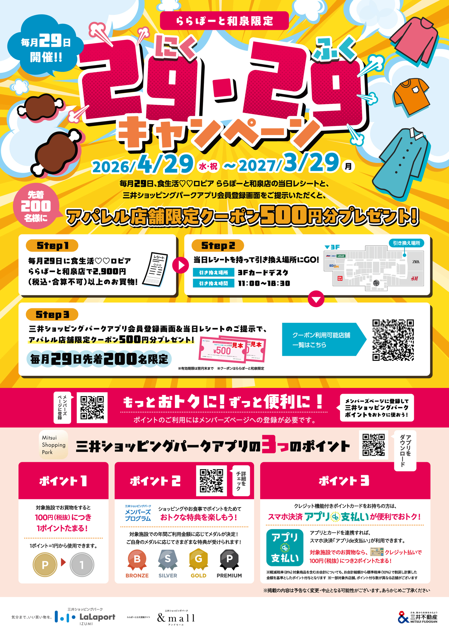 每月29日,在LOPIA LaLaport和泉店凭2900日元(含税,不可合并收据)或以上的收据,