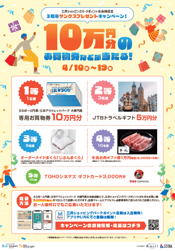 在LaLaport Kadoma 和三井奥特莱斯购物城Osaka Kadoma 参与活动的商店每消费 5,000 日元(含税),即可获得 Mitsui Shopping Park 积分,并参加抽奖活动。