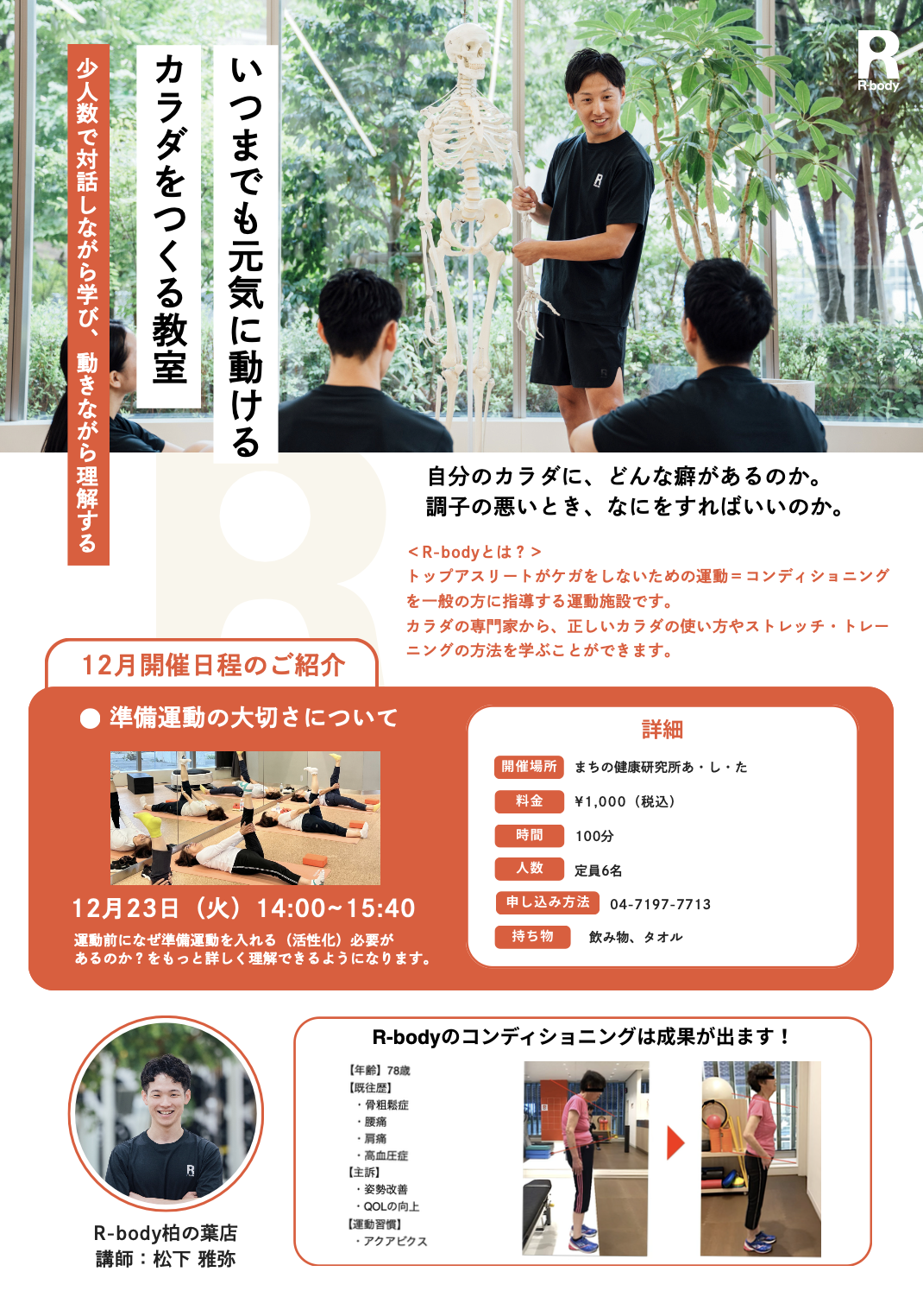 本次健身课程将由一位R-body COACH授课,他同时也向大众传授顶尖运动员为避免受伤而采用的锻炼和体能训练方法。向这位健身专家学习如何正确使用身体,以及如何进行拉伸和训练!