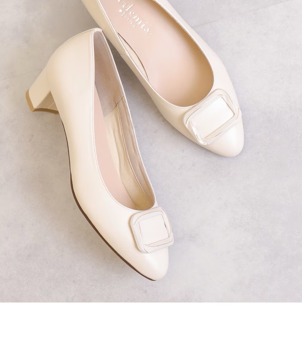 同系色で仕上げたバックルモチーフが、上品で優しい印象の足元に仕上がるパンプス♪
