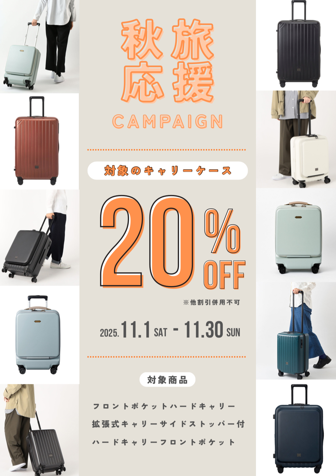 11月期间,我们将举办促销活动,指定款式的随身行李箱可享20%折扣!