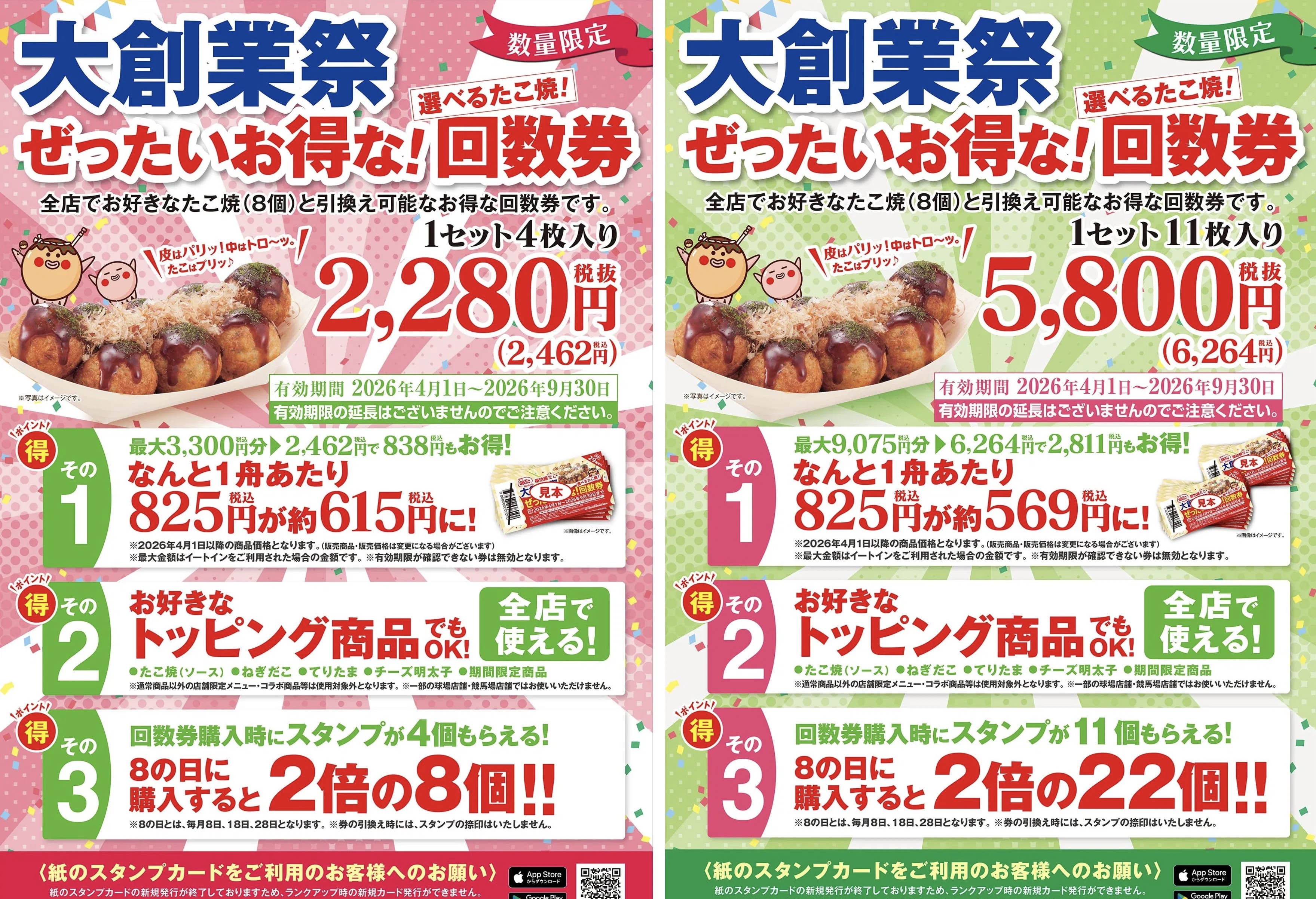 “超值优惠券”可在全国筑地Tsukiji GINDAKO商店(1)兑换“您最爱的章鱼烧(1船8个)”(2)。优惠券分为两种:方便使用的4张装(不含税2,280日元/含税2,462日元)和令人满意的11张装(不含税5,800日元/含税6,264日元)。