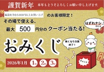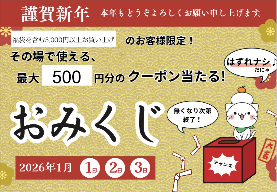 期間中、福袋を含む5,000円以上お買い上げでその場で使える最大500円分のクーポン券が