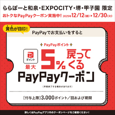 从 12 月 12 日(星期五)至 12 月 30 日(星期二),如果您提前在 PayPay 内领取优惠券,并在参与活动的商店使用 PayPay 付款,您将在稍后获得高达购买金额 5% 的 PayPay 积分。