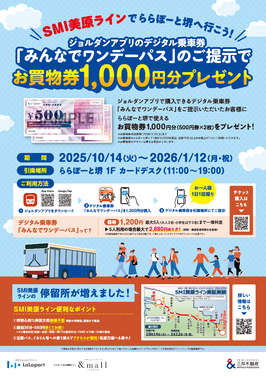 搭乘SMI三原线前往LaLaport堺!出示“Minnade One Day Pass”即可获赠1000日元购物券。