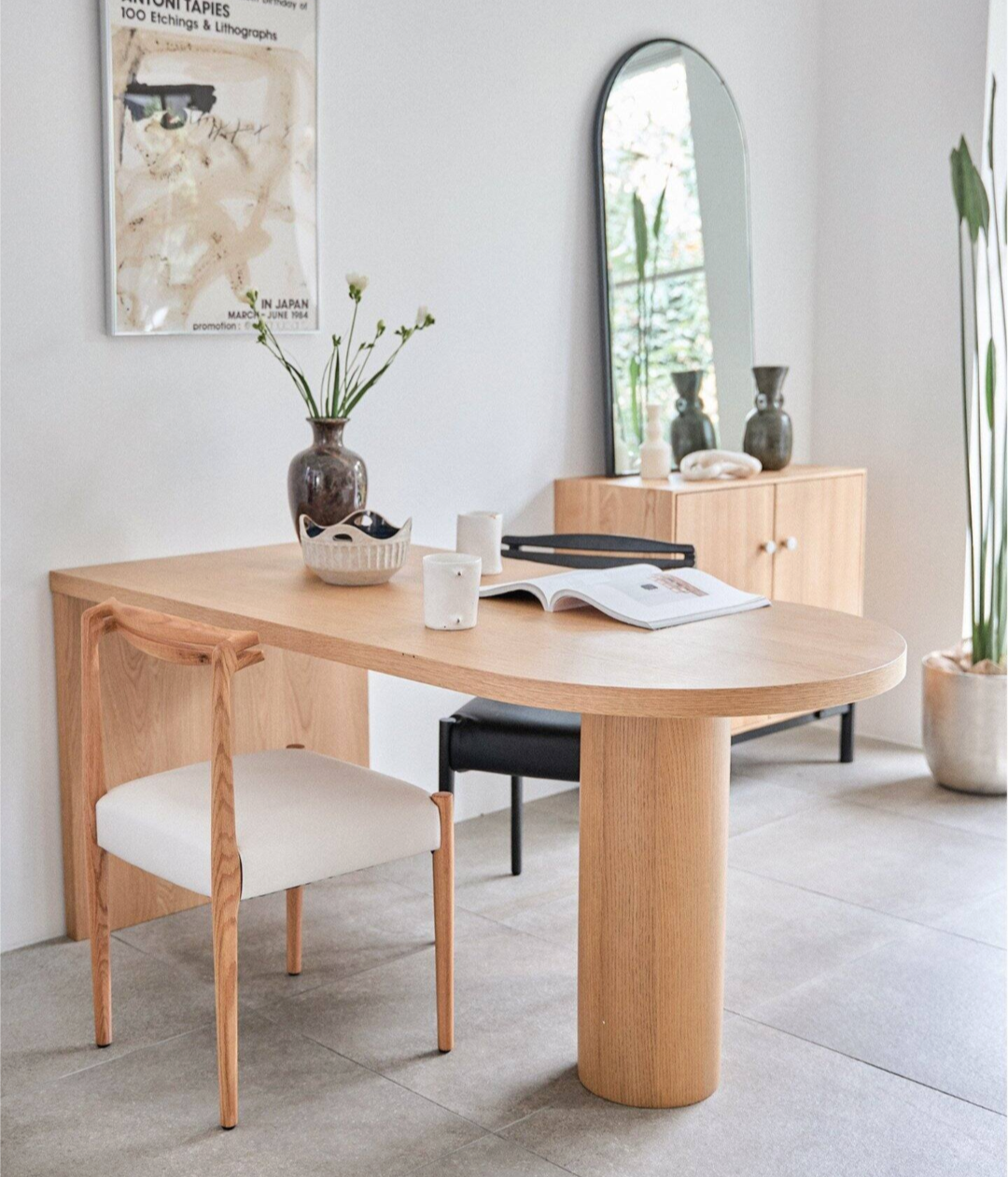 这张餐桌设计引人注目,具有半岛形桌面和圆柱形桌腿。
