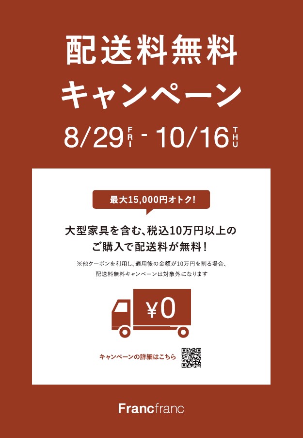 如果您购买价值 100,000 日元或以上的商品(包括家具),则最高 15,000 日元的运费将免除。