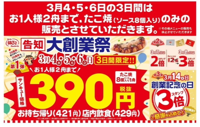 3月4日 (星期三)、5日 (周四)、6日 (周五) 的3天,创业以来人气No.1 “绝对好吃!!章鱼烧(酱汁,8个装)”,单击谢谢促销=感谢『谢谢价格』390日元 (不含税))以/421日元 (含税) 的价格提供!
