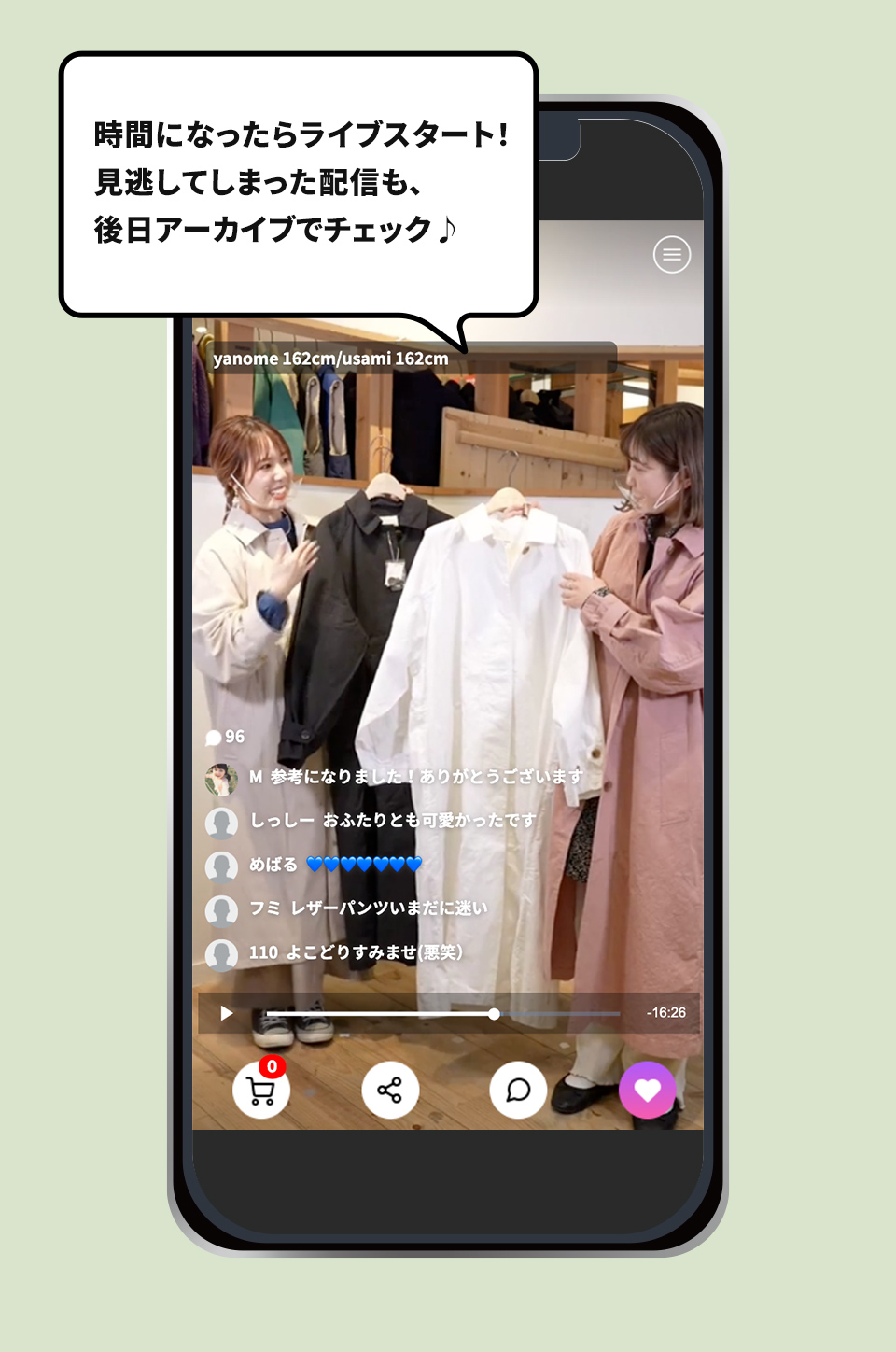 LIVEアイコンが付いた動画をクリックいただくと、配信ページに遷移します。配信時間になりましたら各ライブページにて配信を開始いたします。ライブ配信中はコメントができますので、商品に関するご質問などをご記入ください。