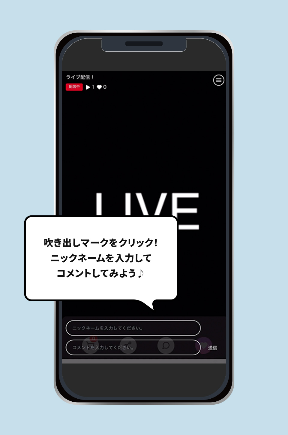 ライブ動画をクリックした後、コメントボタン(吹き出しマーク)をクリックし、「ニックネーム」欄に任意のニックネームをご入力いただくことで、ログインなしでコメントいただけます。