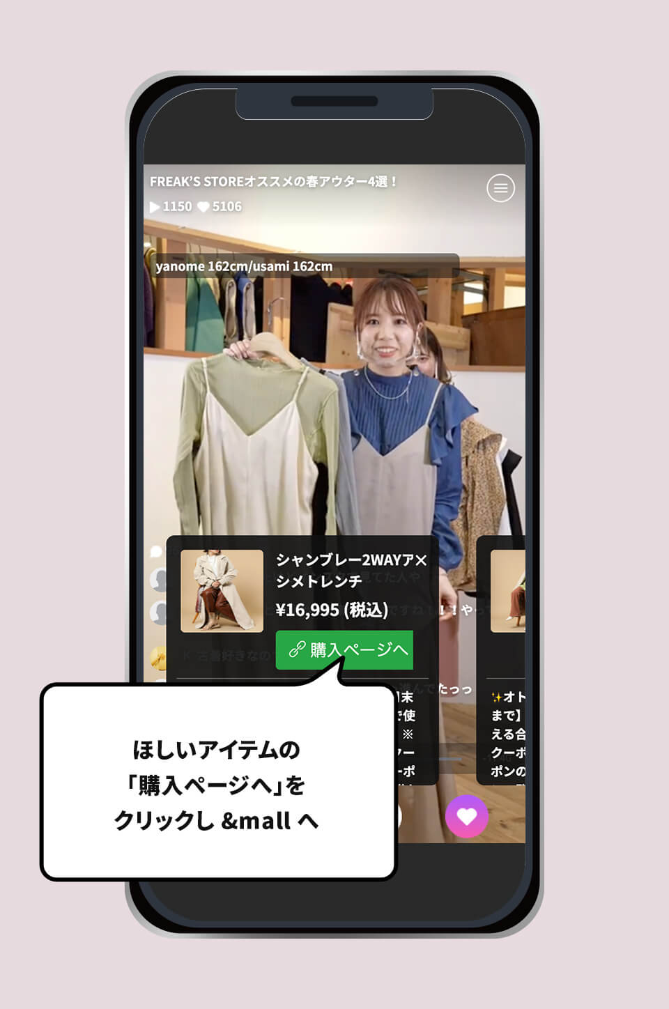 配信ページ内のカートボタンをクリックいただくと、ライブ配信で紹介しているアイテムが表示されます。「購入ページへ」をクリックすると三井ショッピングパーク公式通販サイト