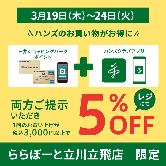 - 三井ショッピングパークポイントとハンズクラブアプリで5%OFF!