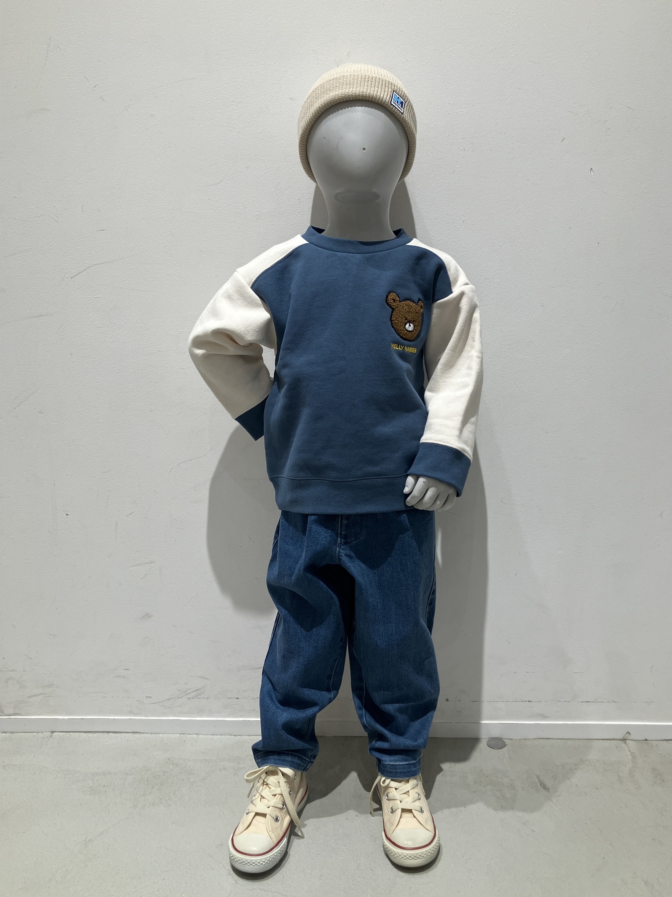 这身装扮很休闲,上身是一件印有 Helly Bear 图案的运动衫,下身搭配牛仔裤。