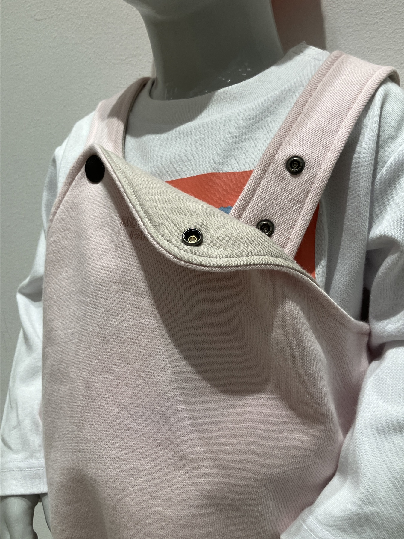 肩背带可用钮扣调整尺寸,裤裆部分为子母扣设计,换衣服或换尿布都很方便。