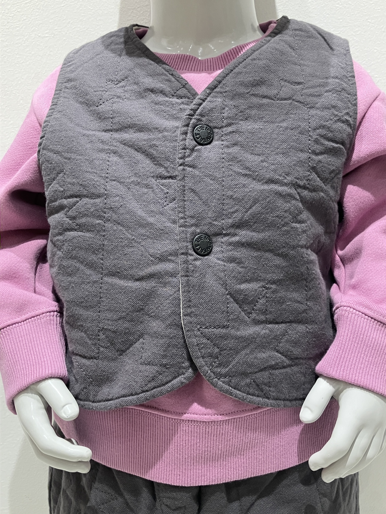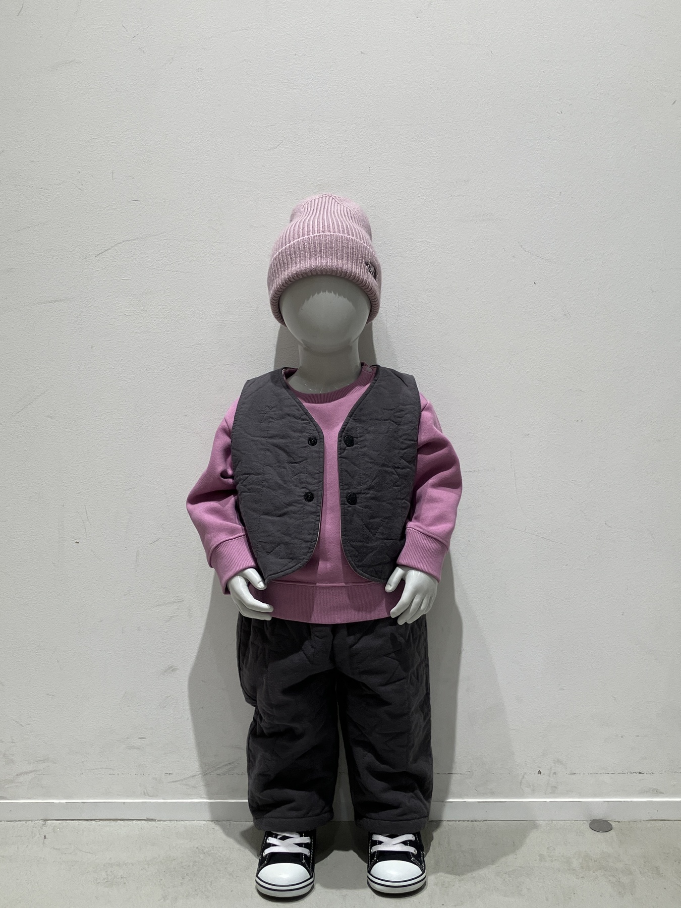 粉红色运动衫搭配绗缝背心与裤子的休闲造型。