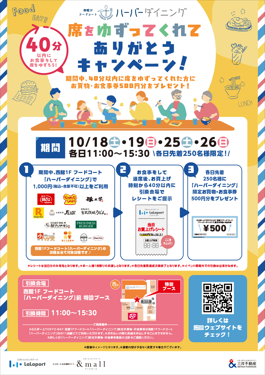 活动期间,凡在40分钟内放弃座位的顾客,均可获赠500日元购物/餐饮券!